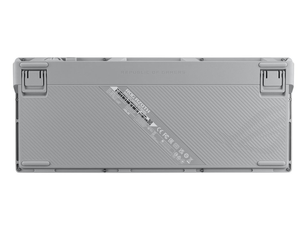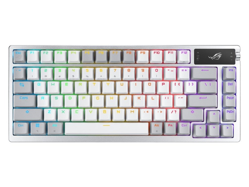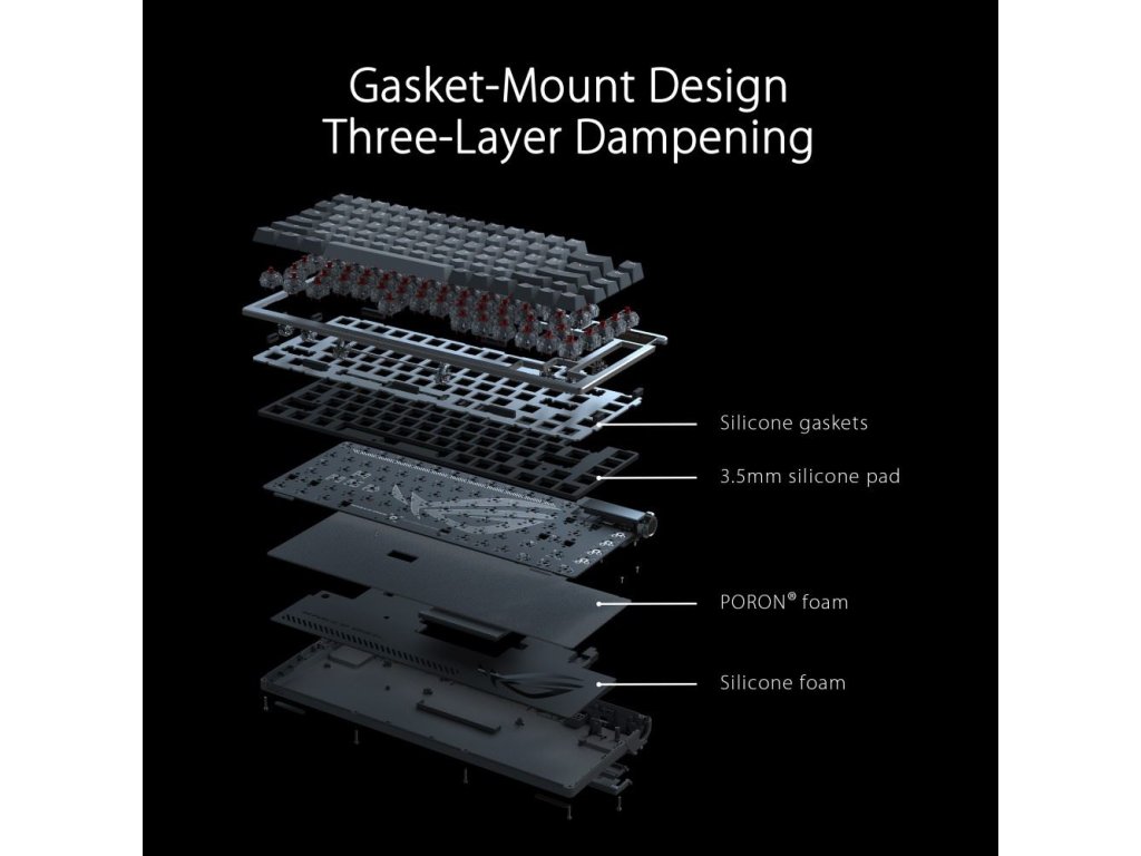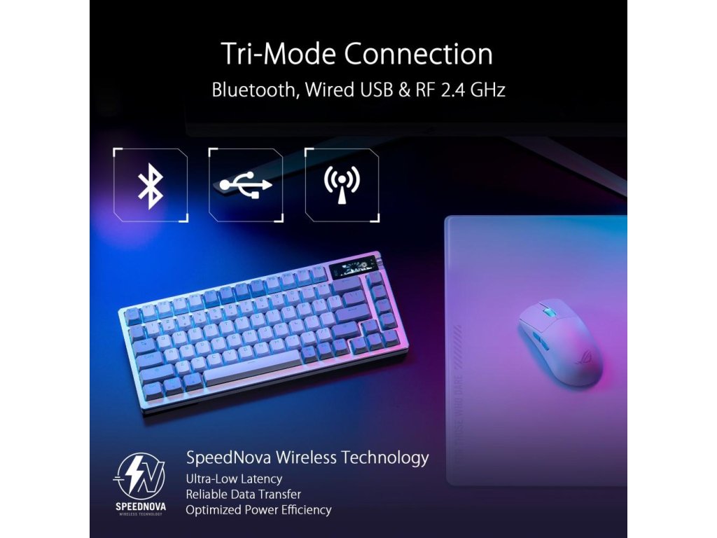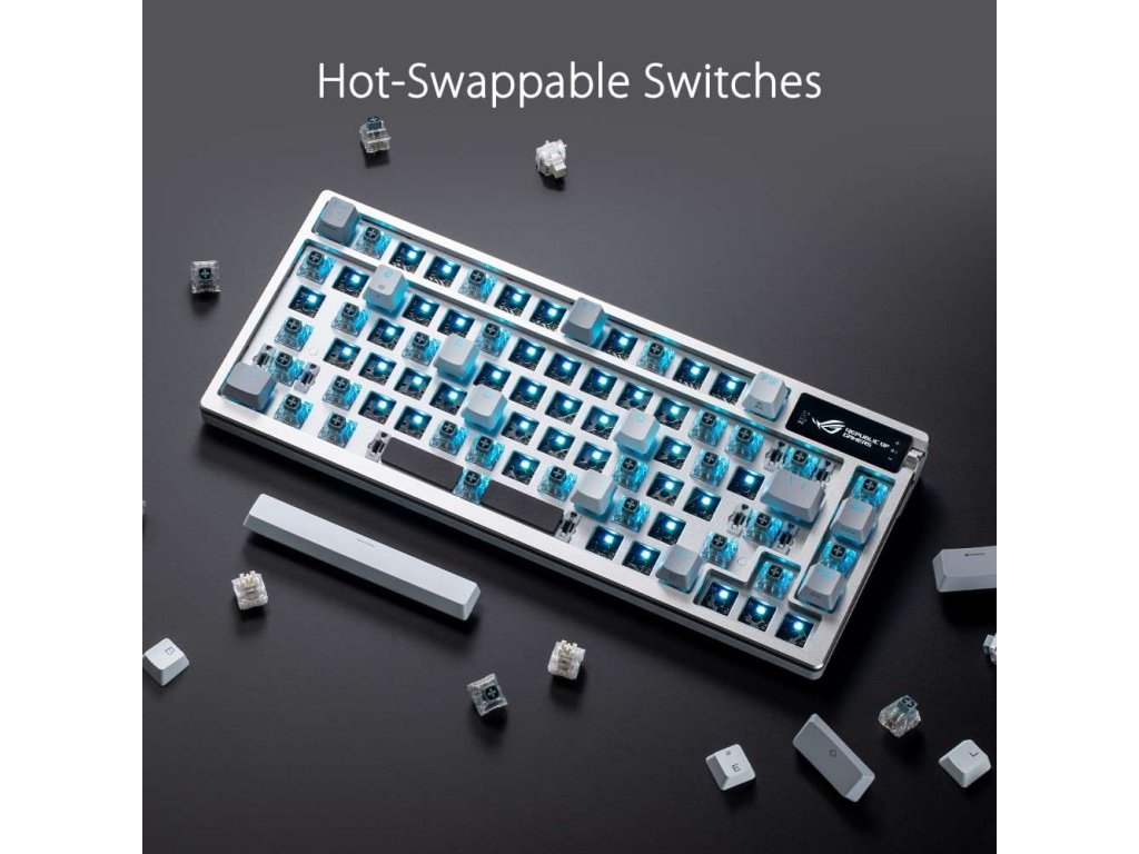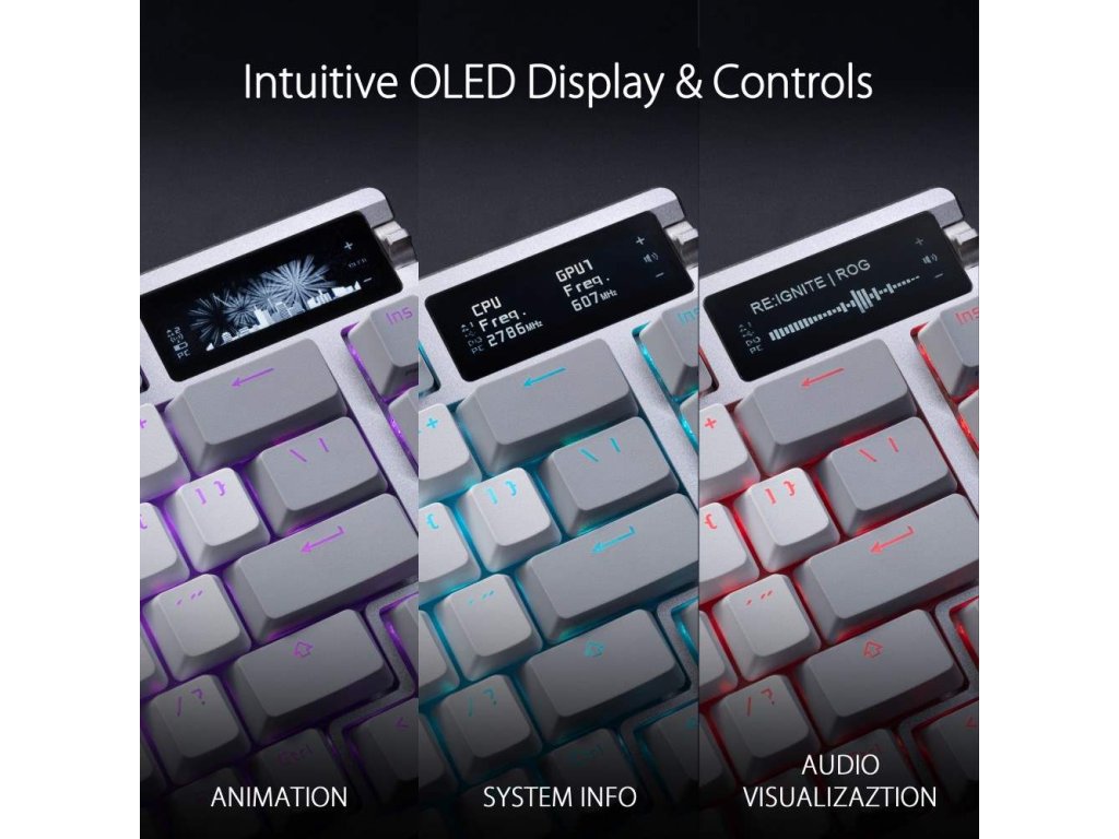 Zakázková herní klávesnice ROG Azoth s tvarovým faktorem klávesnice 75, těsněním, třívrstvou tlumicí pěnou a kovovým horním krytem, vysoce přizpůsobitelná s předem namazanými mechanickými spínači ROG NX vyměnitelnými za provozu, stabilizátory klávesnice ROG, kryty kláves PBT doubleshot a mazací sadou, tri - připojení režimu s 2,4 GHz technologií SpeedNova, OLED displejem, třícestným ovládacím knoflíkem, třemi úhly náklonu a podporou Mac