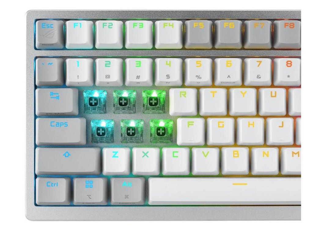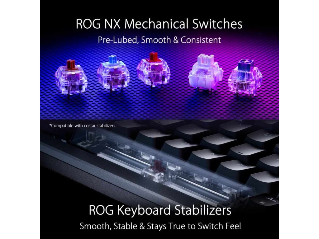 - Mechanické spínače ROG NX vyměnitelné za provozu: Předem namazané spínače pro hladší cvakání a eliminaci odskakování; rychlé ovládání a vyladěné křivky síly ROG poskytují skvělý pocit a konzistenci kláves