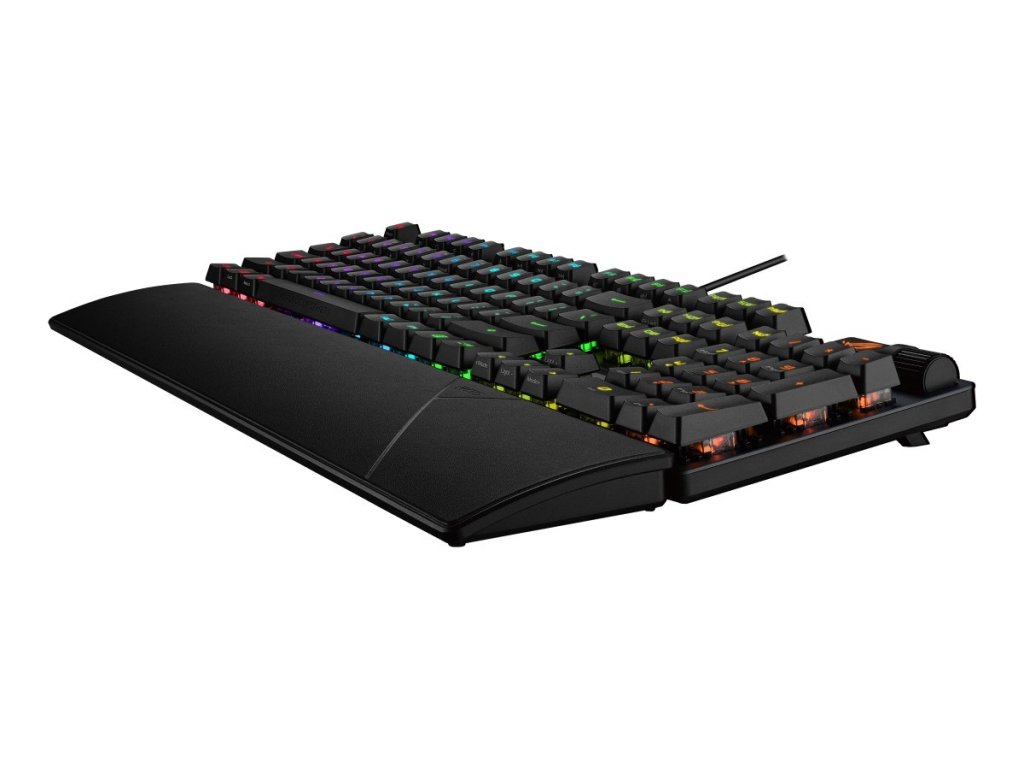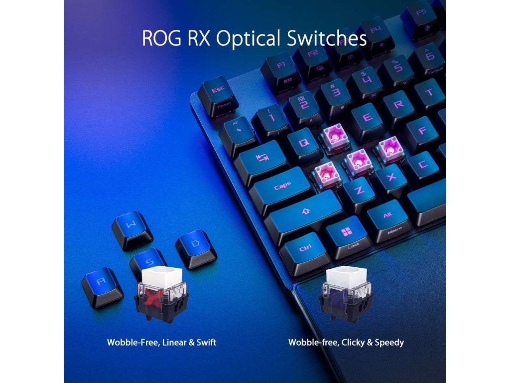 - PBT / ABS klávesy s UV vrstvou: Odolné klávesy ROG PBT doubleshot nebo klávesy ABS s UV vrstvou nabízejí prvotřídní pocit a odolnost proti lesku