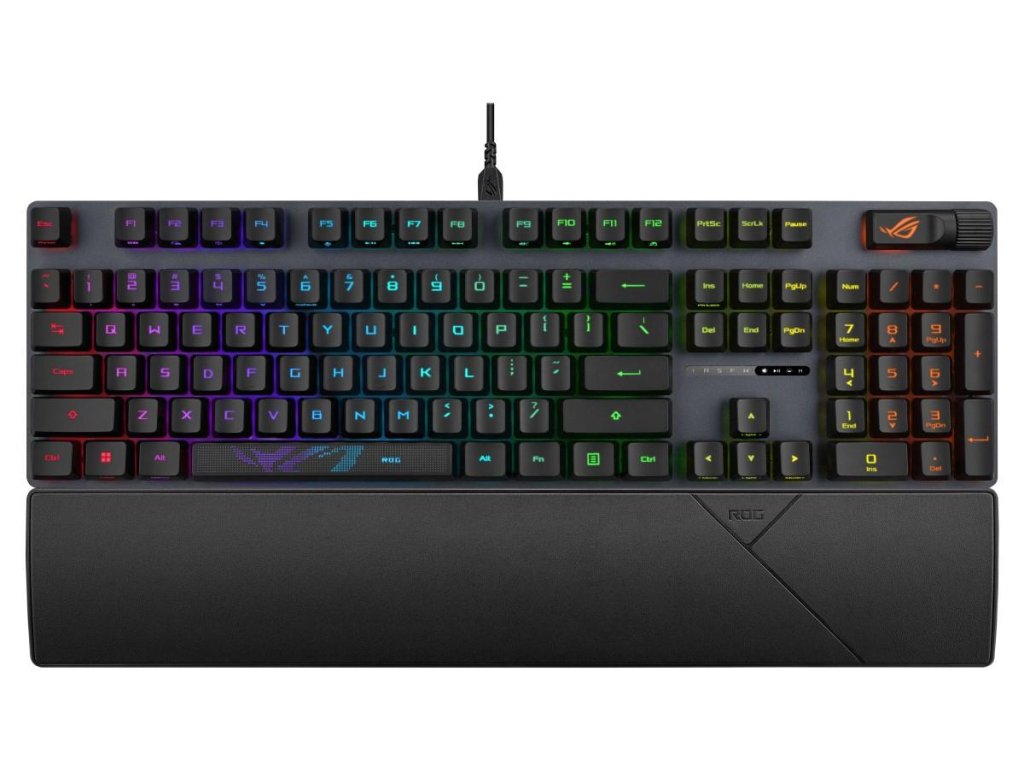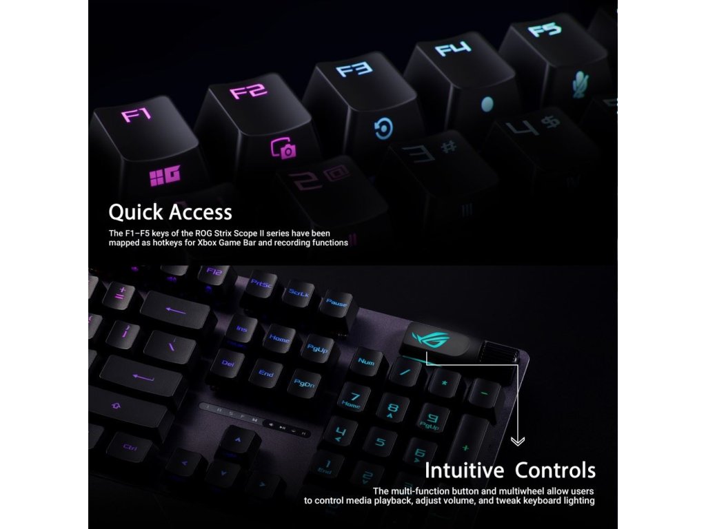 Herní klávesnice ROG Strix Scope II s předem namazanými mechanickými spínači ROG NX Red, pěnou tlumící zvuk, dvojitými krytkami kláves PBT nebo ABS s UV povlakem, klávesovými zkratkami pro streamování, multifunkčními ovládacími prvky, třemi úhly sklonu a opěrkou zápěstí