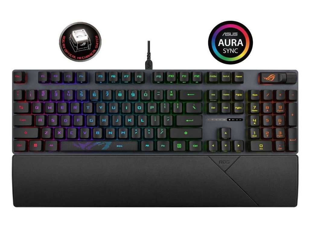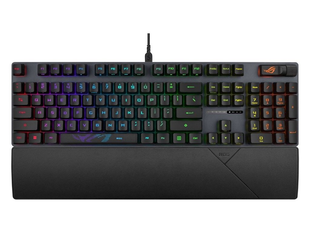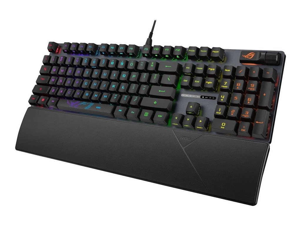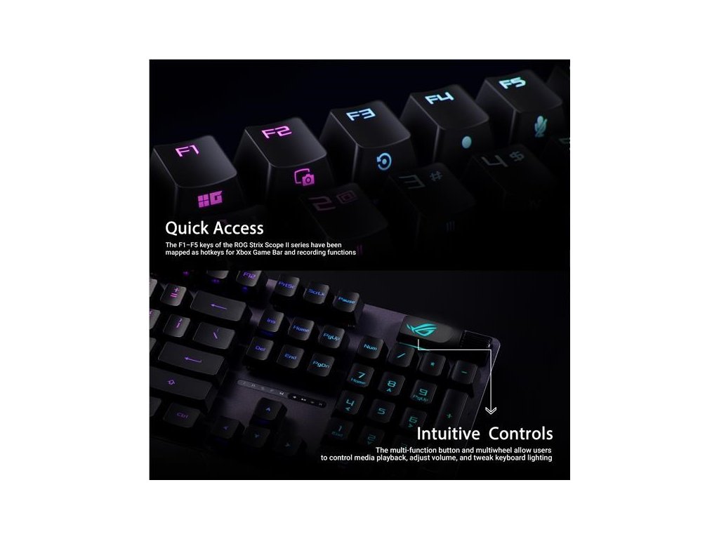 Herní klávesnice ROG Strix Scope II s předem namazanými mechanickými spínači ROG NX Snow a NX Storm, pěnou tlumící zvuk, dvojitými krytkami kláves PBT nebo ABS s UV povlakem, klávesovými zkratkami pro streamování, multifunkčními ovládacími prvky, třemi úhly sklonu a opěrkou zápěstí