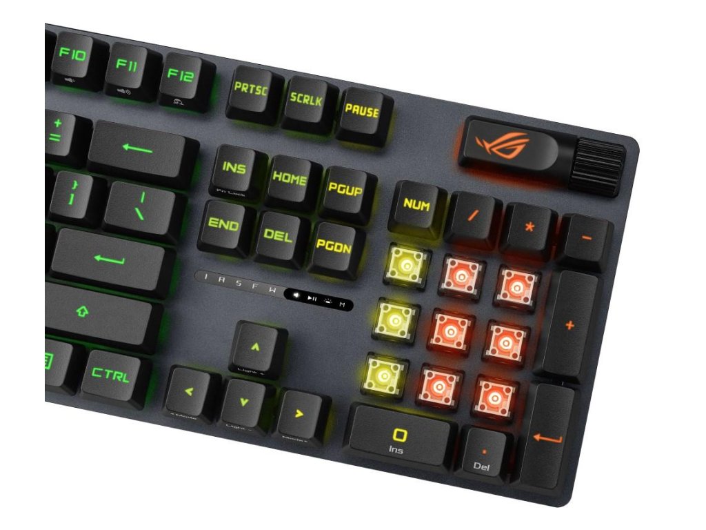 - PBT / ABS klávesy s UV vrstvou: Odolné klávesy ROG PBT doubleshot nebo klávesy ABS s UV vrstvou nabízejí prvotřídní pocit a odolnost proti lesku