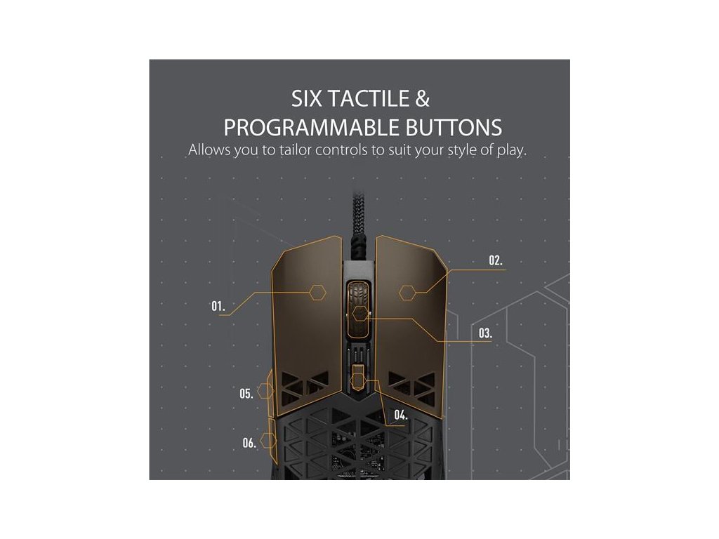 Myš nabízí 6 programovatelných tlačítek, 3 paměťové profily a intuitivní software Armoury Crate pro kompletní přizpůsobení nastavení, citlivosti a makro funkcí. S rychlostí hlášení 1000 Hz, odolnými spínači s životností 60 milionů kliknutí a ergonomickým designem je TUF Gaming M4 Air perfektní volbou pro hráče, kteří hledají lehkost, výkon a odolnost.