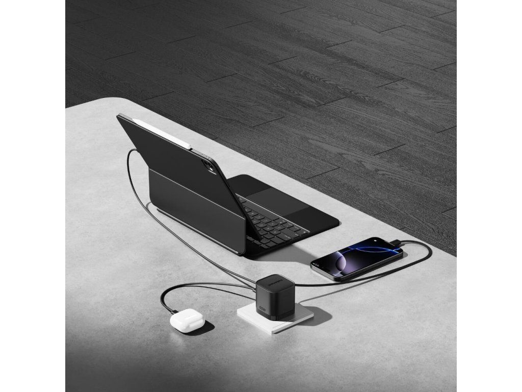 Nabíječka kombinuje maximální výkon, chytrý design a špičkovou bezpečnost. Díky integrovanému USB-C kabelu s délkou 70 cm, dvěma dalším portům (USB-C + USB-A) a výkonu až 65 W nabijete MacBook Air M2 z 0 na 50 % už za 30 minut