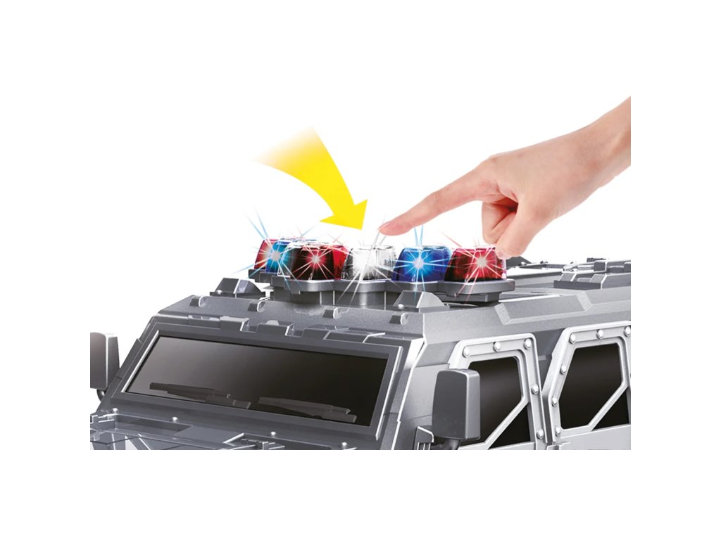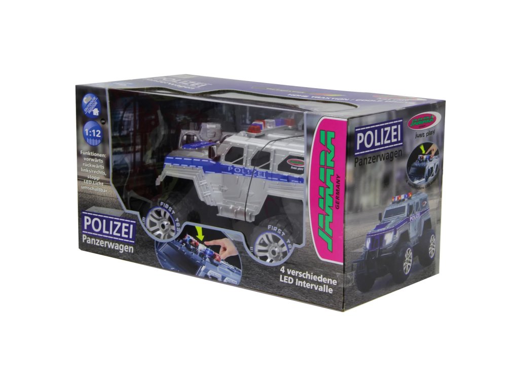 Zásahový tým je na cestě. Jamara má pro extrémní úkoly terénní vozidlo s pohonem 2WD, extra uzamykatelnou zadní nápravou pro vysokou trakci a cool driftování a velkým flexibilním předním nárazníkem. Díky velkoobjemovým monstrózním pneumatikám z pravé gumy a výkonnému elektromotoru nezná policejní obrněné vozidlo téměř žádné překážky! Má také kompletní osvětlovací systém s výkonnými LED diodami a měnitelnými světelnými intervaly. Součástí dodávky je vše, co potřebujete k jízdě!