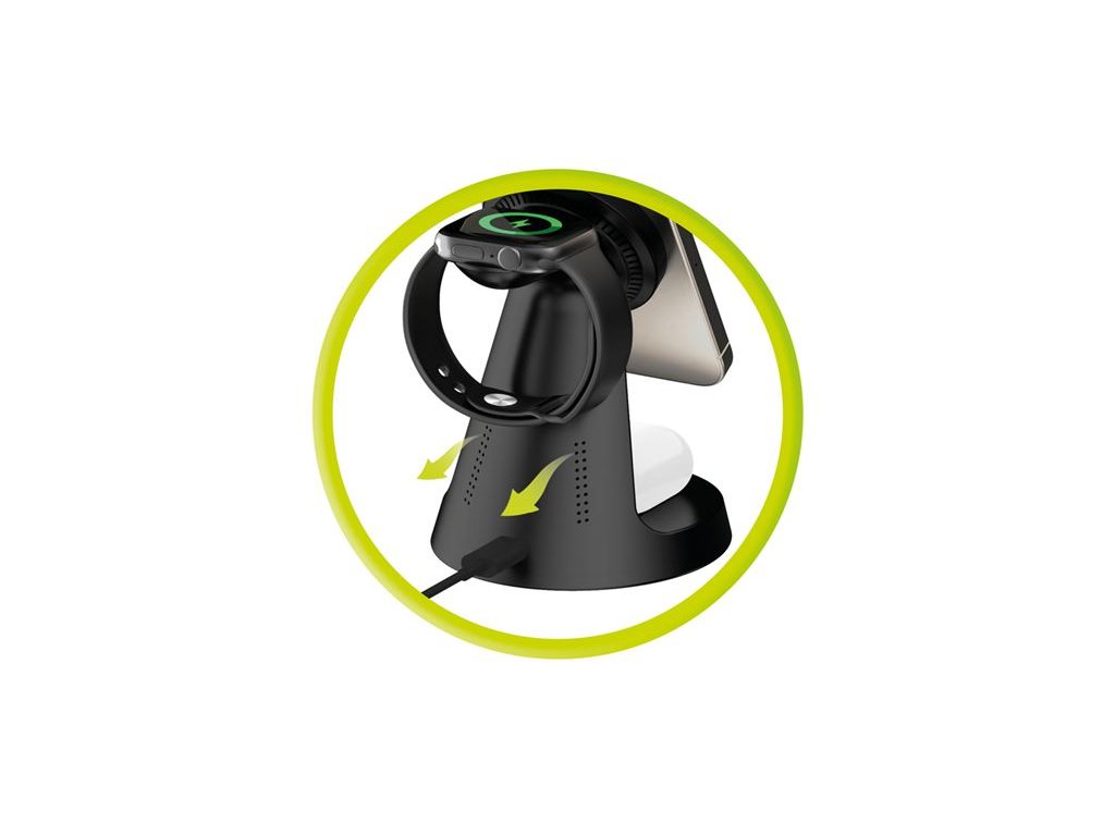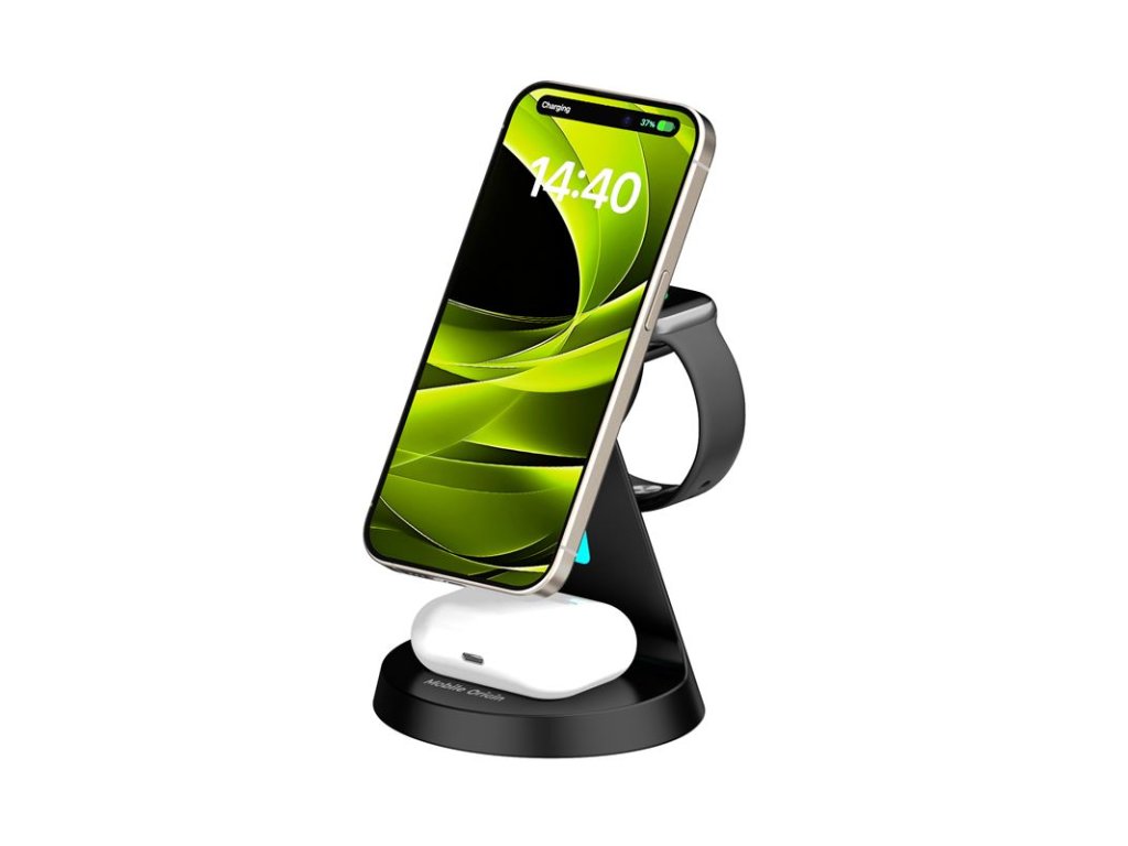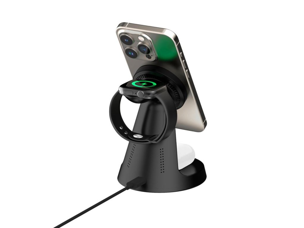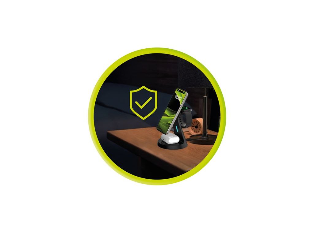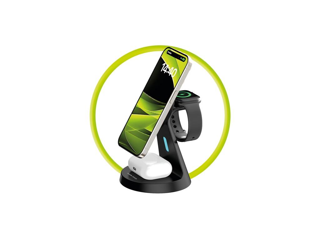 Stojánek 3v1 umožňuje pohodlné rychlé bezdrátové nabíjení telefonu, sluchátek a hodinek současně. S možností horizontálního i vertikálního umístění telefonu je ideální pro každodenní použití.