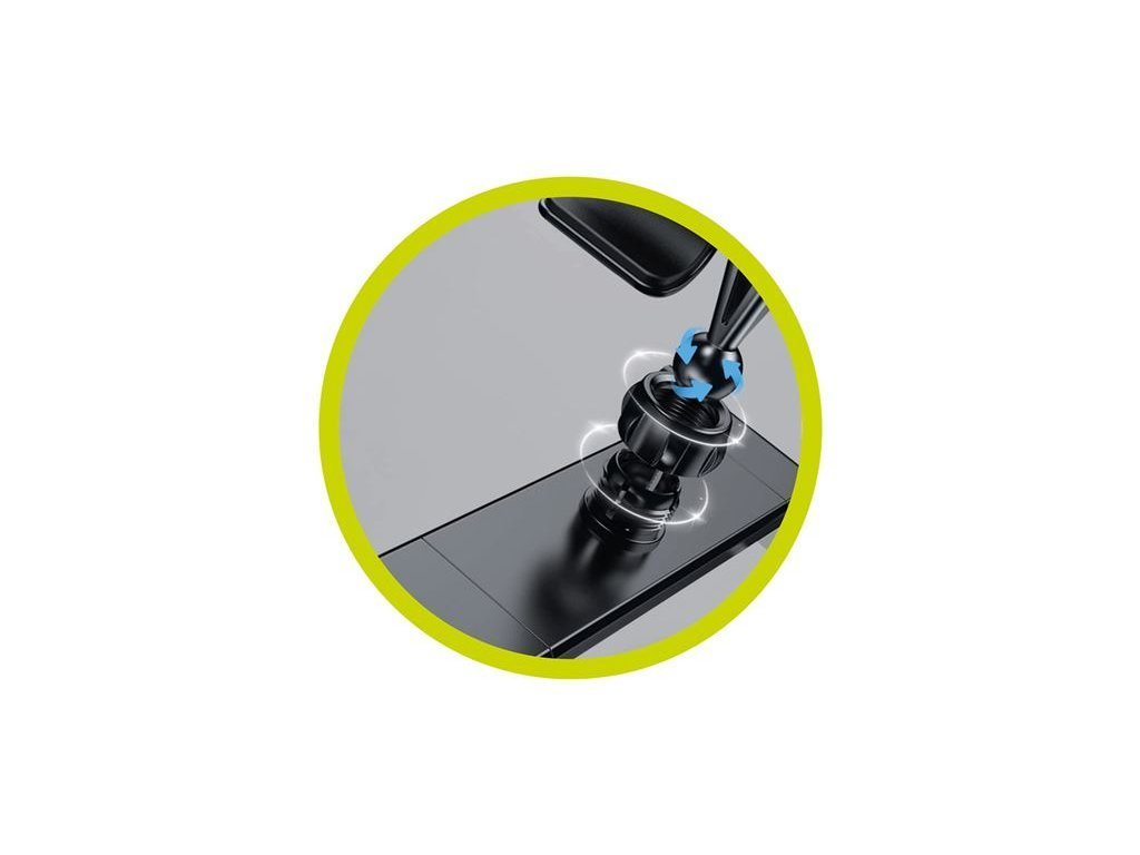 Držák je nastavitelný a zařízení v něm lze naklápět a otáčet.