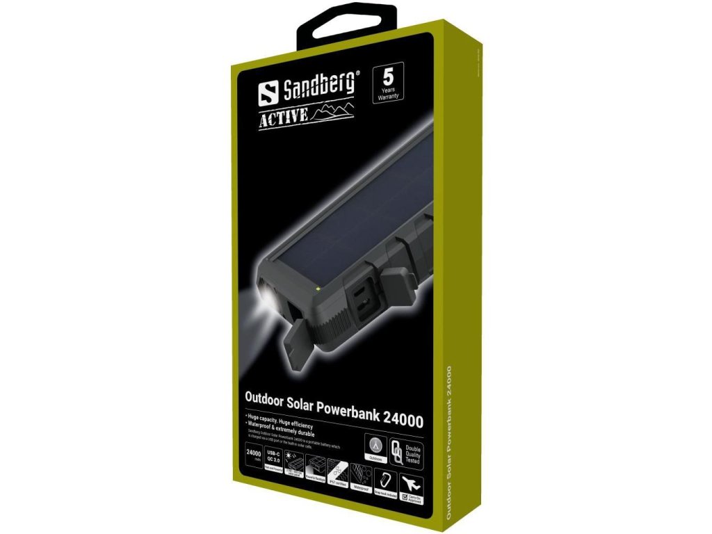 Sandberg Outdoor Solar Powerbank 24000je přenosná baterie, která se nabíjí přes USB port nebo vestavěné solární články.Získáte až 9 nabíjecích cyklů pro typický smartphone a díky pevnému a dešti odolnému obalu vydrží i v drsných podmínkách.S konektorem USB-C pro nabíjení zařízení USB-C. Obsahuje QC 3.0 USB konektor pro rychlé nabíjení podporovaných zařízení.