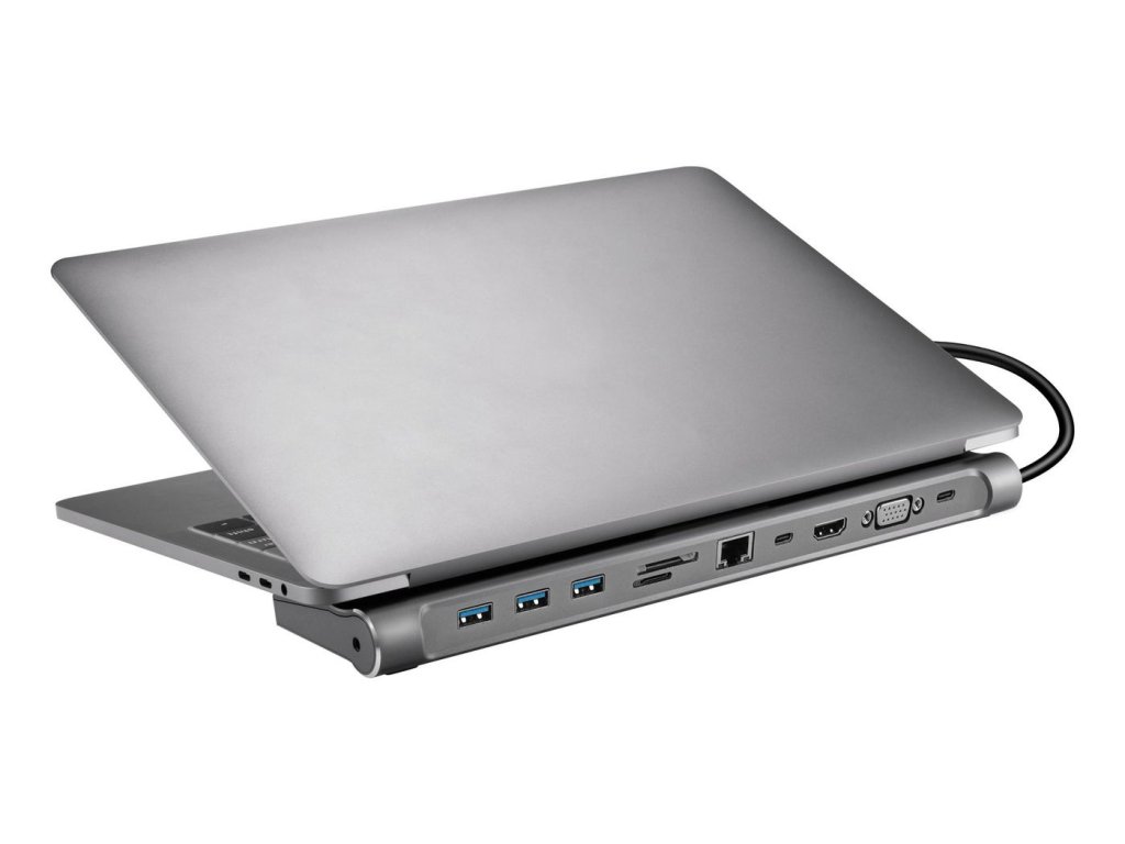 - Výstupy: 1x HDMI (4K/60Hz), 1x VGA (1920 x 1080px), 3x USB 3.0 (3.2 Gen1), 1x USB-C 3.2 Gen1, 1x RJ45, 1x Audio output, 1 x SD card reader slot (SD/SDHC/SDXC/MMC), 1 x Micro SD/TF card reader slot, 1 x RJ45, 1x USB-C PD 100 W